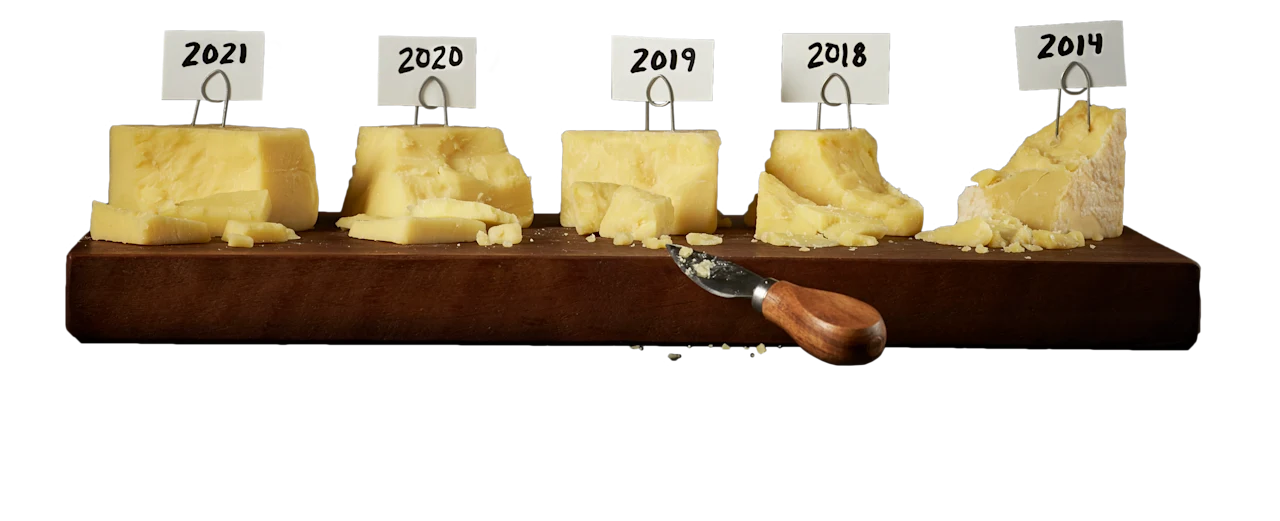 Aged since 2019, this crumbly, dense cheddar has distinctive tropical flavors with notes of pineapple and toasted walnuts.