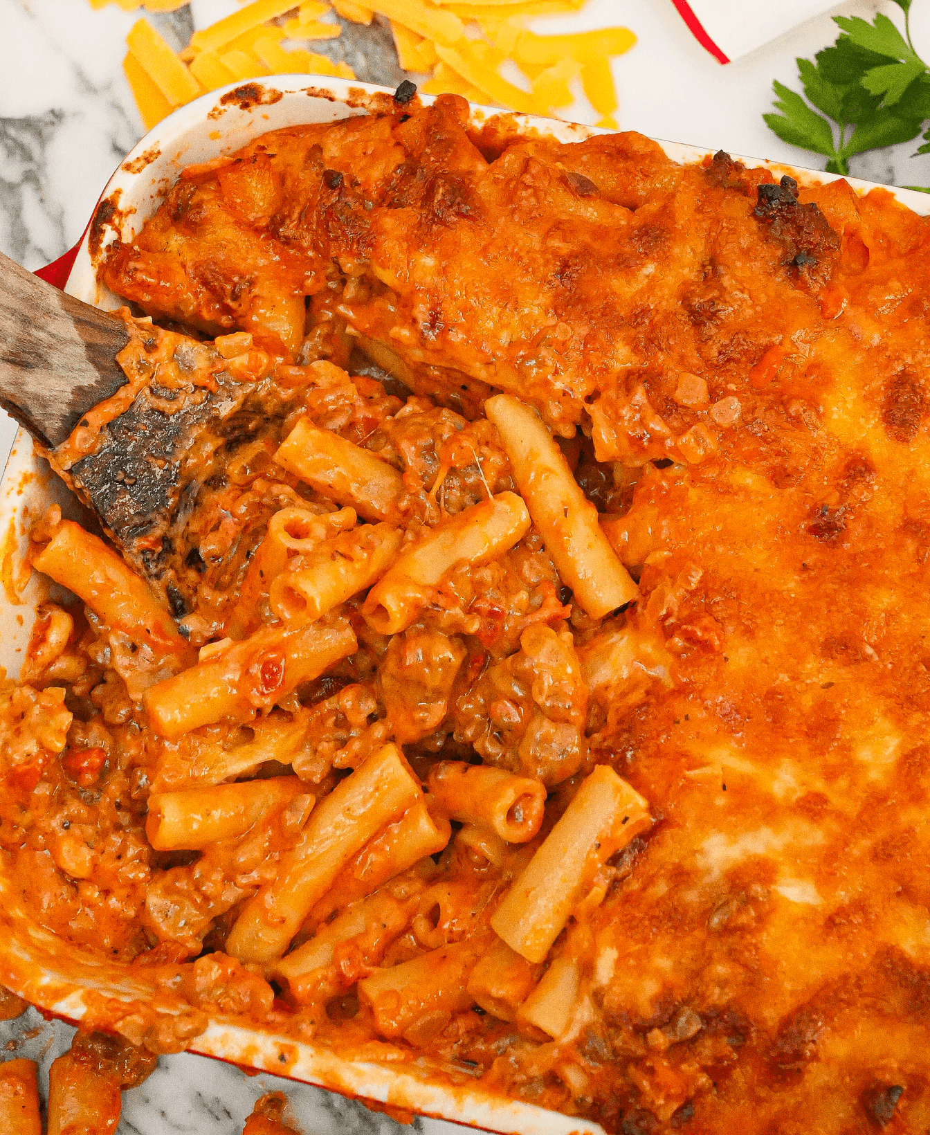 Tip: You can easily make this dish in advance by assembling the pasta bake then covering in the refrigerator for up to 2 days in advance. To bake, cover with aluminum foil and bake at 400°F for 30 minutes, then uncover and bake for another 15 minutes or until the cheese is golden brown.