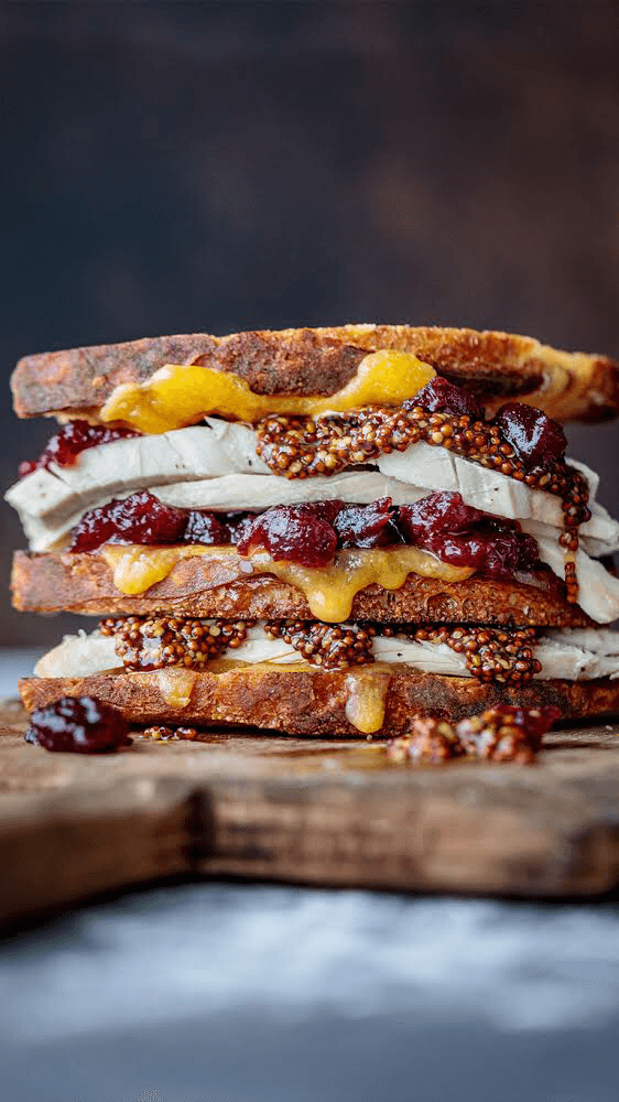 Assemble with sliced warm roasted turkey, cranberry sauce and mustard.