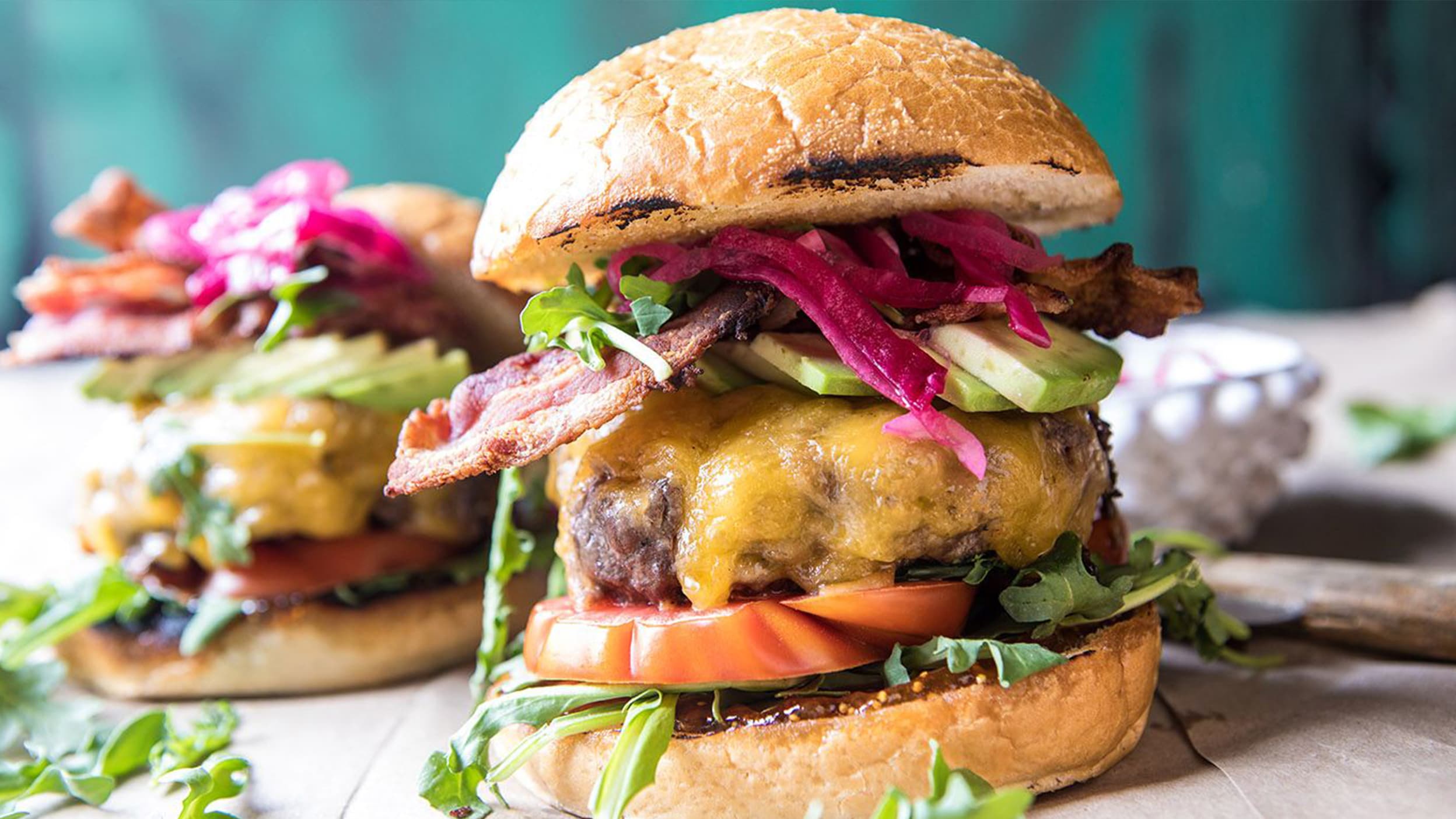4. To assemble, spread a little fig preserve on the bottom of each toasted bun. Place a handful of arugula and a tomato slice on top. Now add the cheeseburger patty and top with the thinly sliced avocado. Drizzle the avocado with lemon juice and then sprinkle with dill and flaky sea salt. Add the bacon, pickled red onions, and finally, the top half of the bun. Dig in!