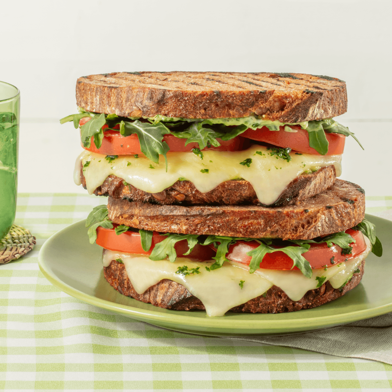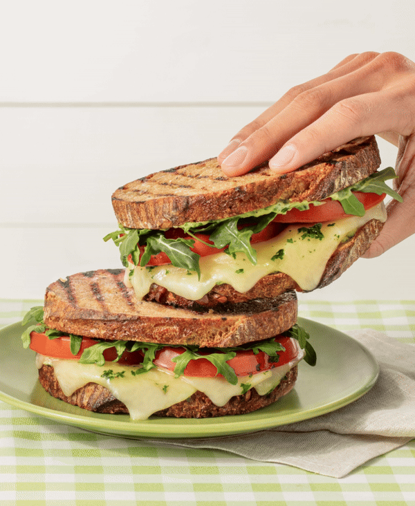 An instant summertime classic. Tillamook Farmstyle Whole Milk Mozzarella Cheese Slices, tomatoes, and pesto on your favorite bread crisped to perfection for a gooey, balanced, satisfying sandwich.