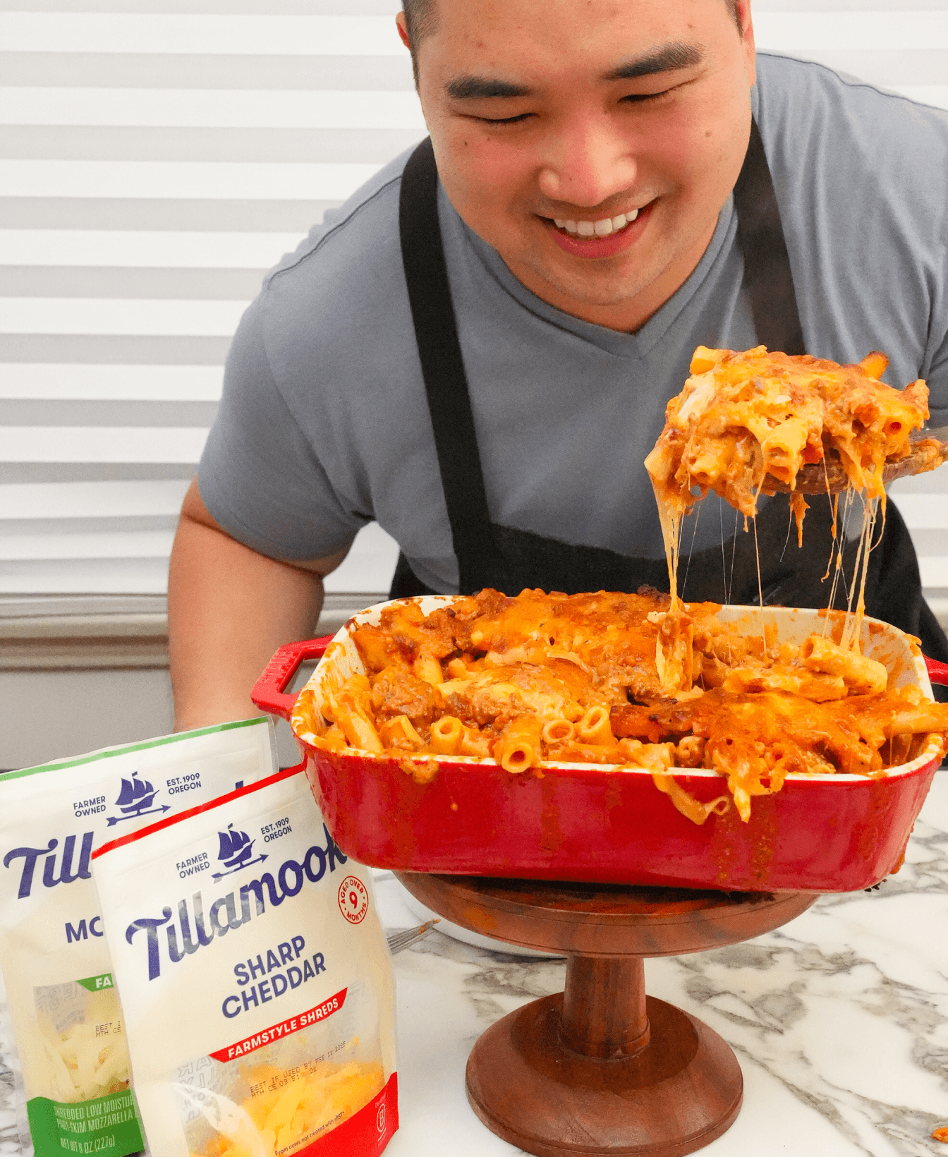 An Italian American classic with a fun Asian twist is the comfort dish you need! Tender ziti pasta, Italian sausage, and a spicy cheesy tomato sauce is made and topped with Tillamook Sharp Cheddar Farmstyle Shreds that makes for a bold, comforting dish that your family will love!