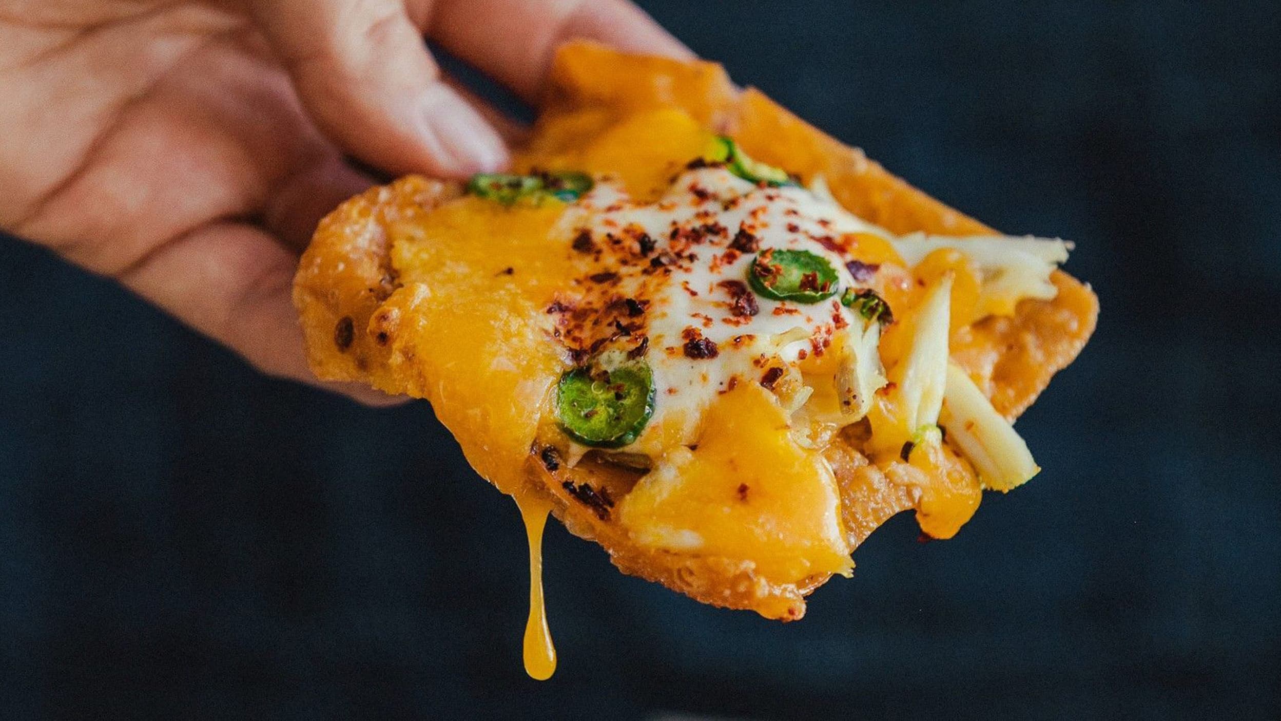 Next, place 2-3 slices of jalapeño on each nacho and drizzle the cream cheese sauce on top.