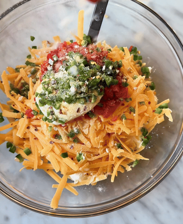 Place the cheddar cheese, cream cheese, mayonnaise, pimento, minced jalapeño, garlic powder, cayenne pepper, and onion powder in a large bowl.