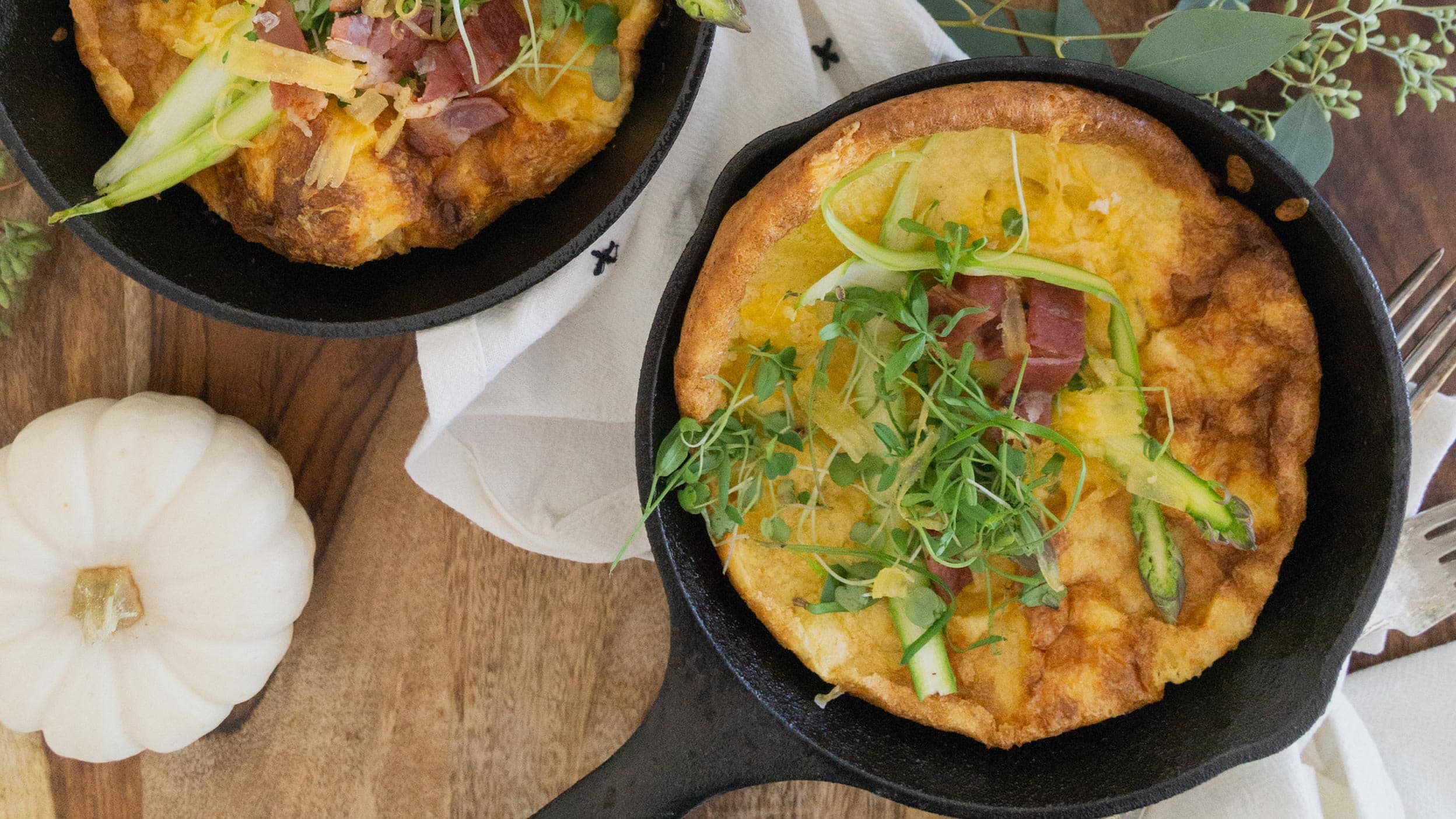 Top with asparagus and microgreens and enjoy eating it out of the mini cast iron!