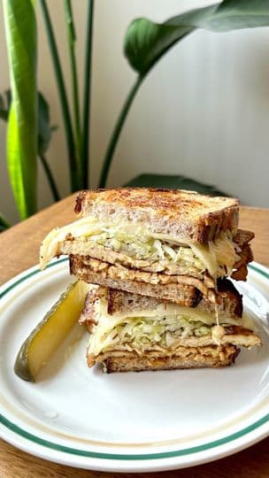 To build the sandwich, cover both slices of bread with Tillamook Unsalted Butter and place both in a pan butter-side down. On one slice add a generous amount of sauce, 4-5 slices of tempeh, and sauerkraut. On the other add 2-3 Tillamook Swiss Cheese Slices.